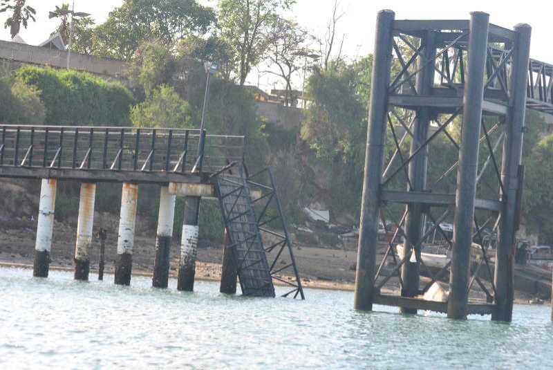 A damaged footbridge at the Mtongwe Ferry crossing area in Mtongwe, Mombasa County. A Pontoon where the ferry docks was also damaged and might take a week to be repaired. [File, Standard]