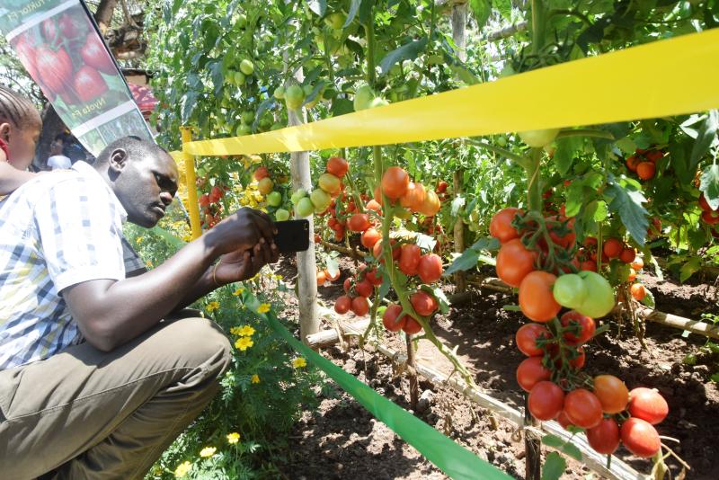 A show goer takes some photos of a tomatoes exhibition farm at the Mombasa International Agricultural Society of Kenya (ASK) show at Mkomani grounds. [Gideon Maundu/Standard]