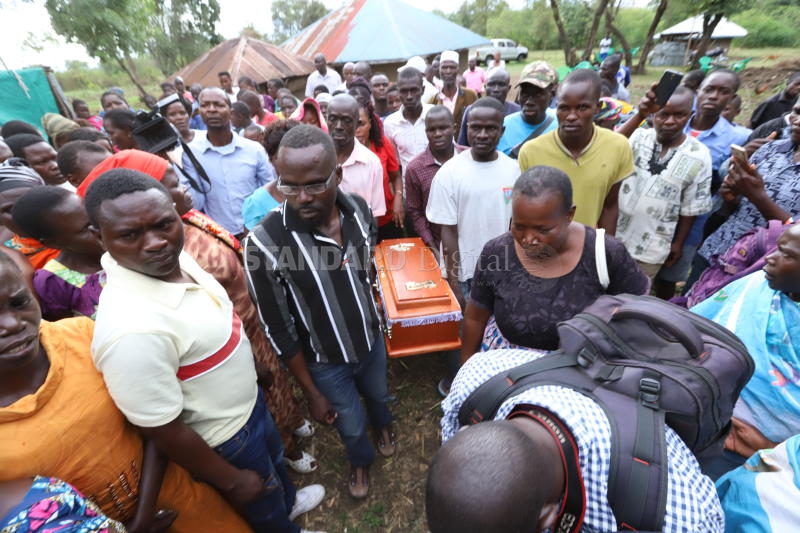 Friends and relatives carry the casket bearing the remains of Sharon Otieno's foetus at Magare village, Homa Bay County, on Friday. [Denish Ochieng, Standard]