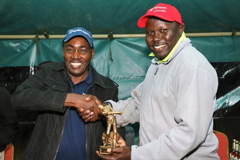 Swiss Resort Mount Kenya Golf Resort developer Ronald Ndegwa (left) presents "Swing to Uplift" charity golf overall prize to Gideon Chebii (right. Sh1.1m in aid of Our Lady of Perpetual Help Education Center (Olphec) was realized during the golf tournament played at the par 72 course in Kieni Constituency, Nyeri County, September 15, 2018. [Mose Sammy, Standard]