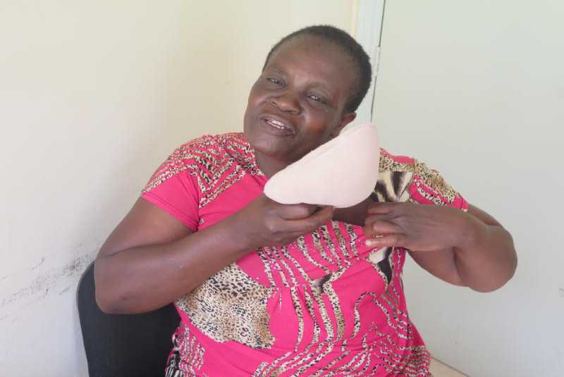 Fridah Kambayi, 50, puts on a temporary prosthesis on her left side of the breast. She underwent an operation after being diagnosed with cancer of the breast in 2016. JUNE 24, 2018. [PHOTO: MERCY KAHENDA]