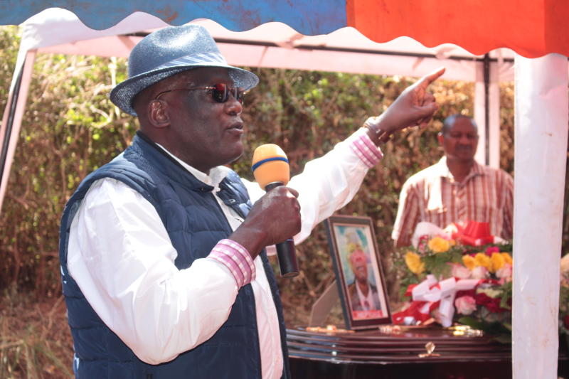Former Machakos County Senator Johnston Muthama speaks during the burial of the late Philip Ngaile at Kangundo, Machakos County on October 3, 2018. Mr. Muthama told Wiper party leader Kalonzo Musyoka to wake up from political slumber. [Photo: John Muia, Standard]