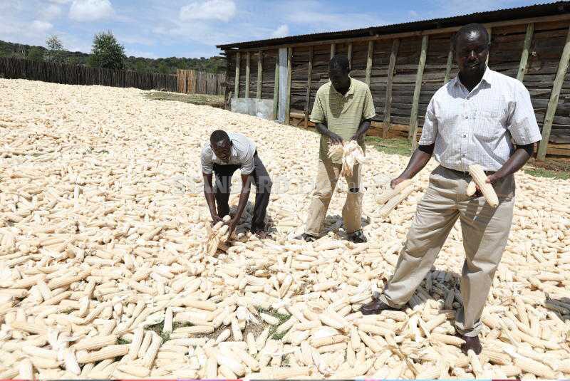 Farmers dry maize harvested at Kabomoi village, Uasin Gishu County. [Kevin Tunoi, Standard]