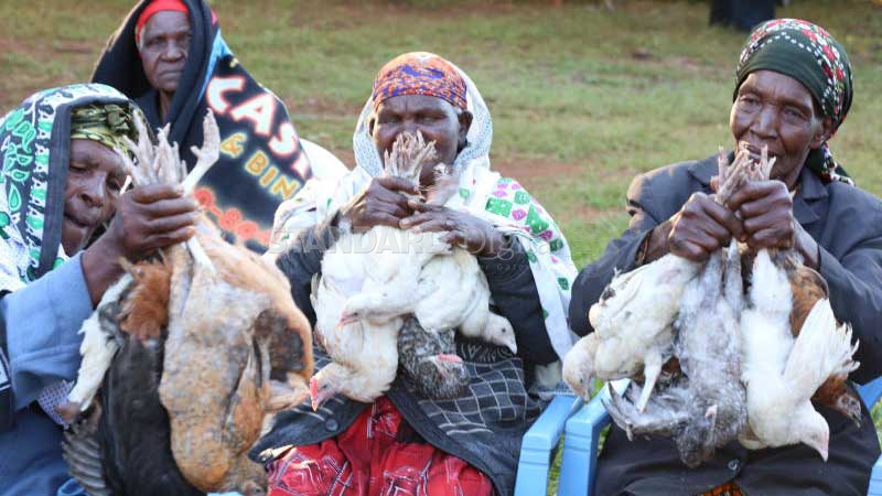 Women from Tetu, Nyeri county receive chicken, blankets and chick mash from CEO of Team Adonai Ephantus Thuku during the poverty eradication project, on June 28,2018. [Kibata Kihu, Standard]