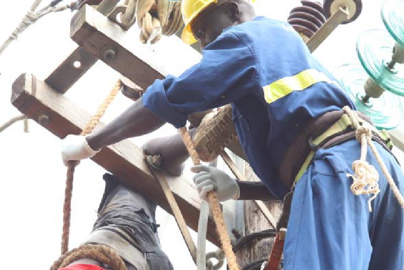 A Kenya Power official lowers the body of a man found hanging on a high voltage power pole at Kisian in Kisumu on December 20, 2018. [Collins Oduor, Standard]