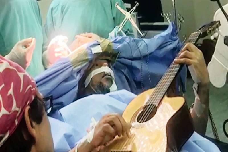 South African jazz artist Musa Manzini plays his guitar while lying on the operating theater table during a six-hour brain surgery to remove a tumor. [Courtesy]
