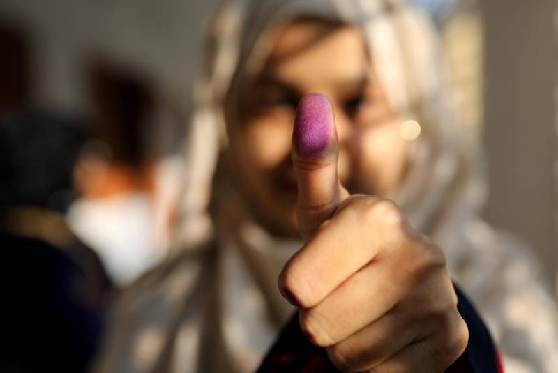 A woman displays her inked thumb after casting her vote for the general election in Dhaka, Bangladesh, December 30, 2018. [REUTERS]