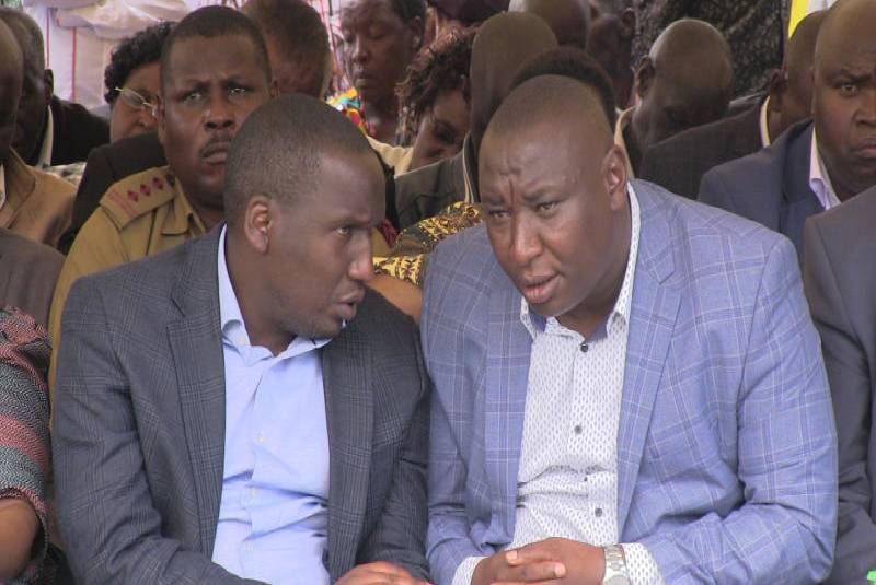 Kericho Senator Aaron Cheruiyot and Kipkelion West Member of Parliament Hillary Koskei share a word during an interdenominational prayer meeting: Koskei has called on President Uhuru Kenyatta to take action against Jubilee Vice Chairman David Murathe. [File, Standard]
