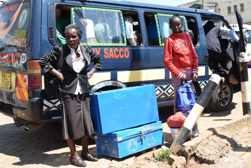 A parent escorting her child to school for Form One admission waits to board a matatu in Meru last week. [Olivia Murithi, Standard]