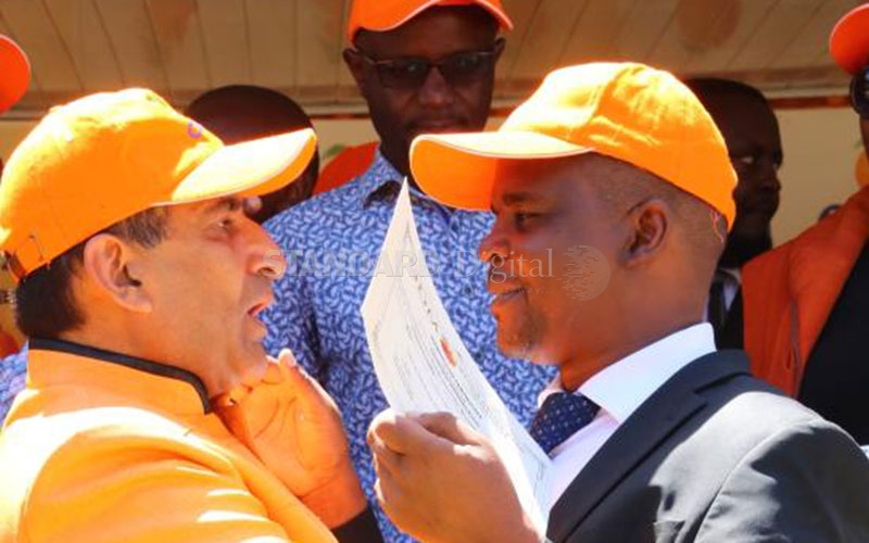 Parliamentary aspirants Irshad Sumra (left) of Embakasi South and Christopher Karan of Ugenya celebrate after being presented nomination certificates by ODM National Election Board Chairperson Judith Pareno at Orange House last week. [David Gichuru]