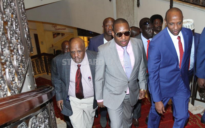 Governor Mike Sonko (centre), County Assembly Majority Leader Abdi Guyo (right) and other leaders arrive for a meeting in Nairobi. [File, Standard]