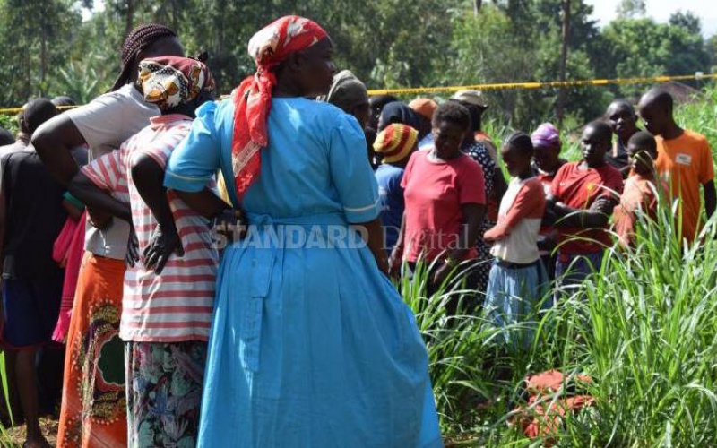Residents mull around bodies of five watchmen who were killed at Kilingili market on the border of Kakamega and Vihiga counties. [Eric Lungai/ Standard]