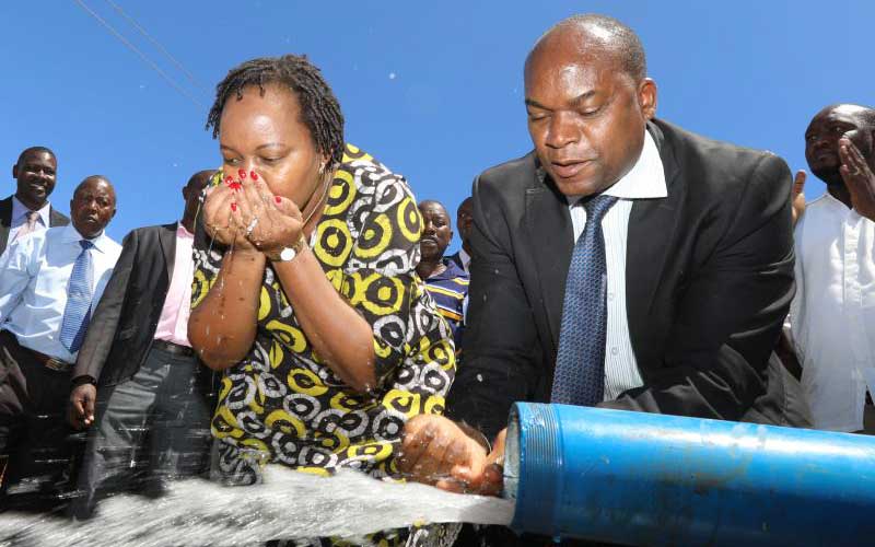 Kirinyaga Governor Ann Waiguru and her deputy Peter Ndambiri during the commissioning of Mwea-Makima water project on March 28, 2019 [Mose Sammy, Standard]