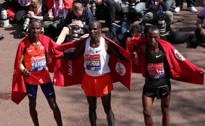 Kenya's Eliud Kipchoge celebrates with second placed, Ethiopia's Tola Shura Kitata and third placed, Britain's Mo Farah after the men's elite race [Courtesy]