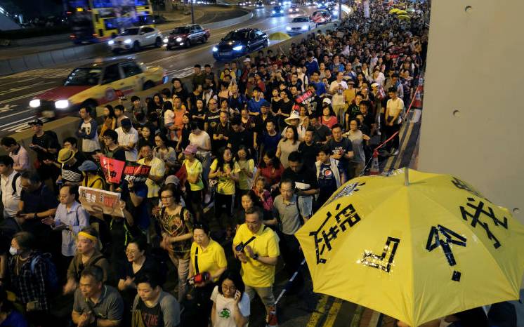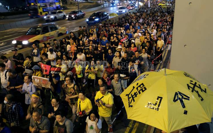 Demonstrators hold yellow umbrellas, the symbol of the Occupy Central movement during a protest to demand authorities scrap a proposed extradition bill with China, in Hong Kong, China April 28, 2019. [REUTERS]