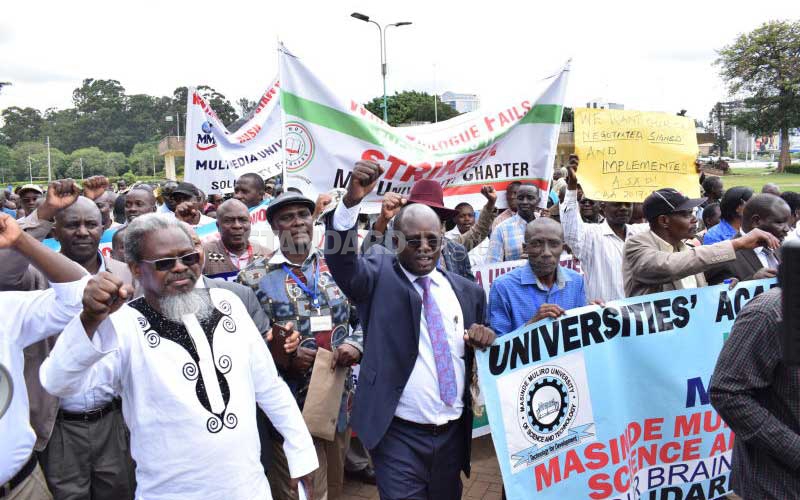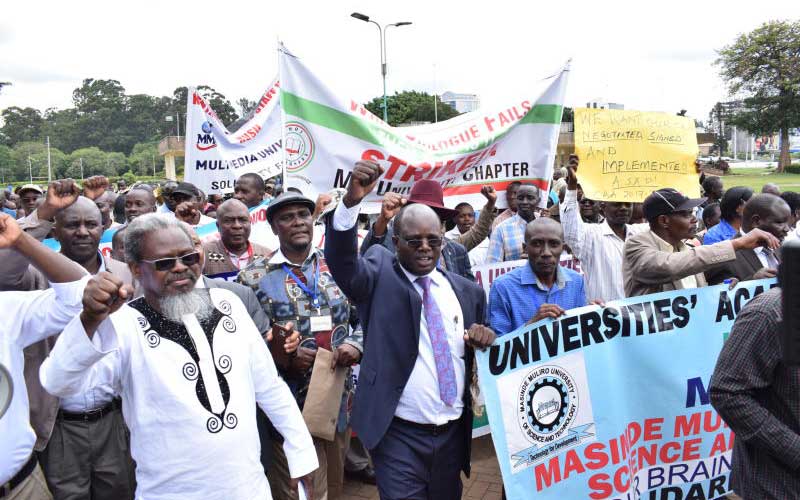University Academic Staff Union leaders and members hold a protest during a strike to push for salary hike. [David Gichuru, Standard]