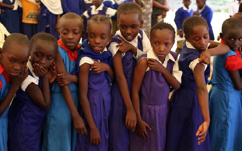 Kenyan schoolgirls looking at a friend who is getting vaccinated against HPV which causes cervical cancer. [Courtesy]