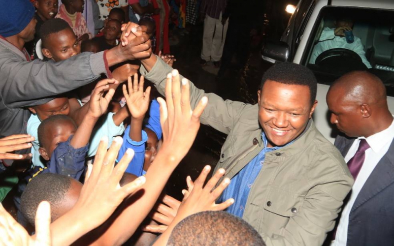 Machakos Governor greeting residents of Athi River after inspecting the Athi River solar street lighting program. [Erastuc Mulwa/Standard]