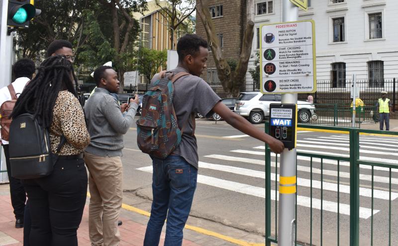 Pedestrians prepare to cross a section of the Walking Cross outside the City Hall; County Government has installed pilot digital light to help pedestrians cross roads. (Photo Samson Wire)