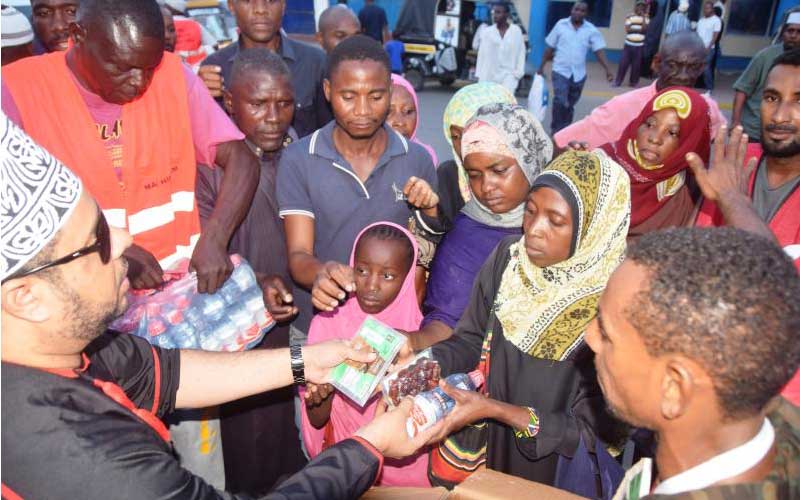 Jubilee Party Coast regional co-ordinator Farid Swaleh (left) distributes some of the food donated by President Uhuru Kenyatta at Digo Road roundabout. [Gideon Maundu, Standard]
