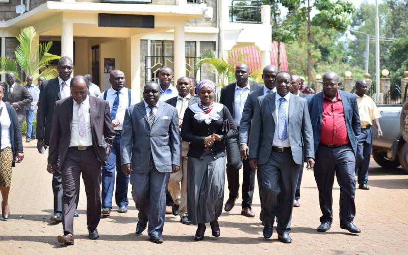 Vihiga Governor Wilber Ottichilo (Second right) with County Assembly Speaker Hasna Mudeizi (centre) with other members arrive for a function at the county headquarters in Mbale. [Standard]
