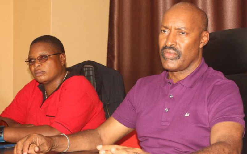 Kenya County Government Workers Union General Secretary Roba Duba (right) address a press conference in Nairobi alongside National Chairperson Mary Murongoro. [David Njaaga/Standard]