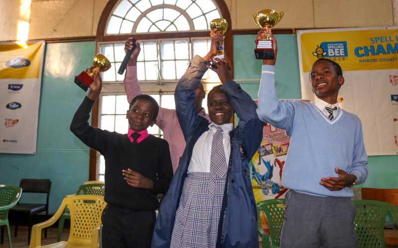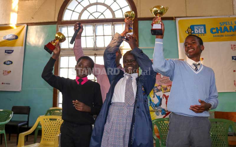 From left: Lawrence Kuria (Second runners up), Annuarite Nyiha (Winner) and Victor Nzoka First runners up) of Nairobi County’s Spell Like A Champion 2019 competition. [James Wanzala, Standard]