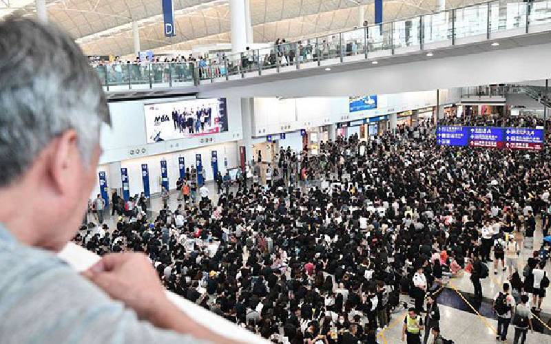 Hundreds of pro-democracy activists, some wearing face masks and helmets, staged a sit-in at Hong Kong's airport on August 9, 2019 hoping to win support from international visitors for their movement. [AFP]