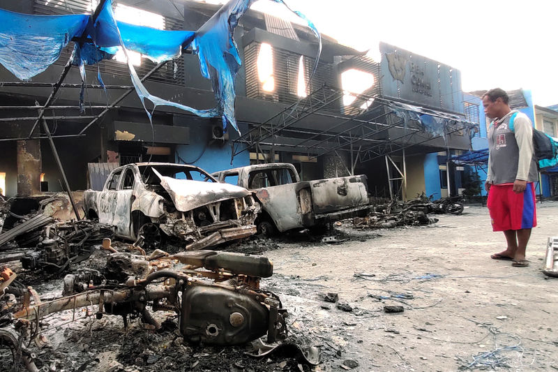 A man looks at damaged vehicles in front of Indonesia's Customs and Excise office after a riot in Jayapura, Papua, Indonesia. [Reuters]
