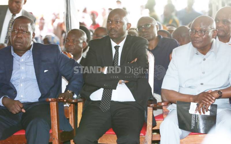 Interior CS Fred Matiang'i, Nyamira Senator Okongo Omogeni and Kisii Governor James Ongwae during the burial of businessman Stephen Ongenyo at Kerumbe, Nyamira County. [Sammy Omingo, Standard]