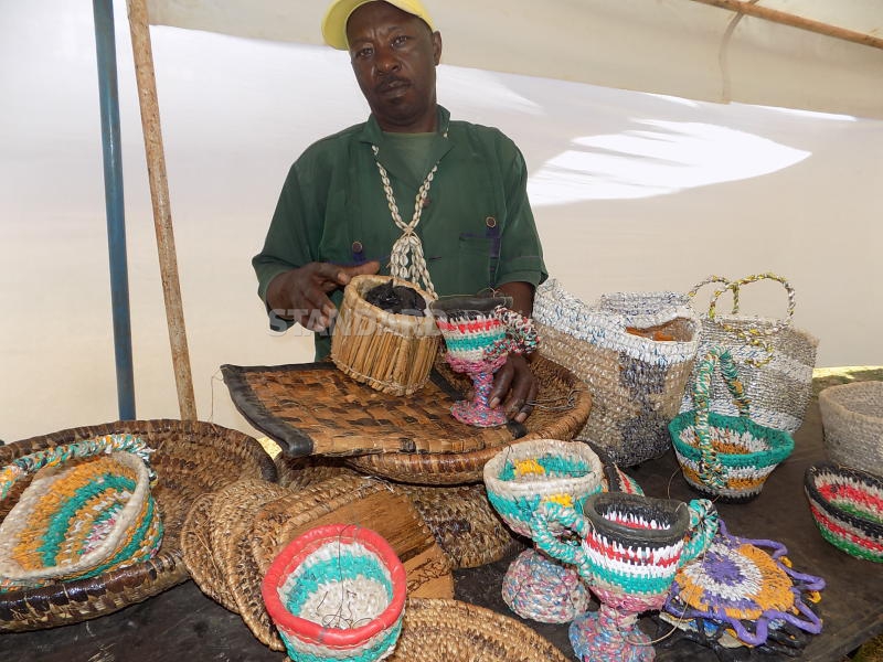 Henry Kariuki displays some of the products he makes from recycled waste at his shop in Kavutiri market, Embu. [Joseph Muchiri/Standard]