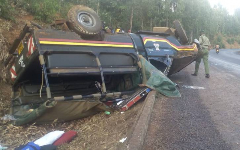 The overturned wrecked vehicle which was ferrying prison warders and inmates to Meru Law Courts. [Image: Standard]