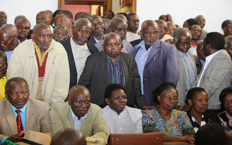 Retired teachers led by their secretary Gidraff Kimata (right) checking on a document at Nakuru high court on October 25,216 where the Controller of Budget Agnes Odhiambo appeared before Lady Justice Janet Mulwa to answer summons issued upon her by the court over retired teachers Pension payment.