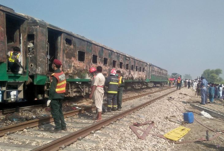 The fire destroyed three of the train’s carriages near the town of Rahim Yar Khan in the south of Punjab province.