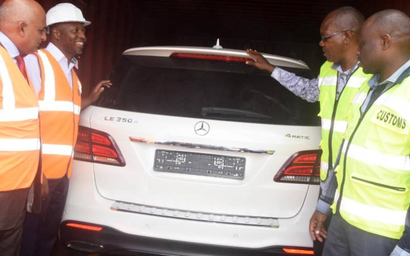 Port workers and officials from Kenya Revenue Authority watch as one of the four containers loaded with three V8 Range Rovers and a Mercedes Benz is loaded into a ship to be shipped back to Britain. [Gideon Maundu/Standard]