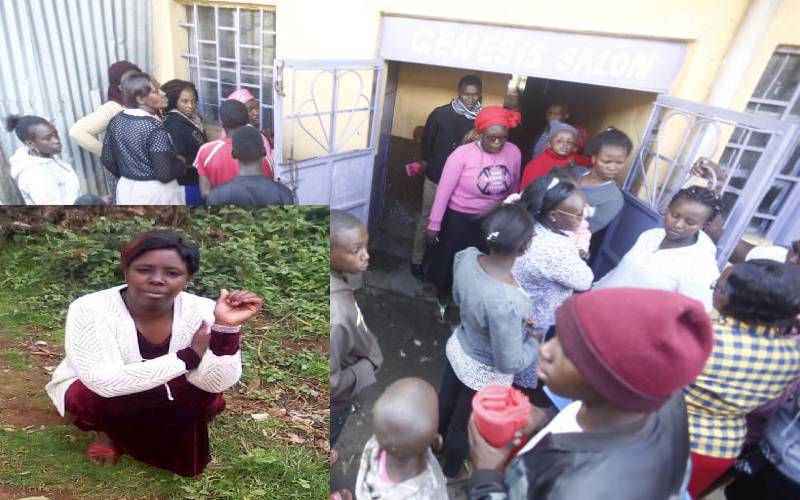 Residents of Molo town in Nakuru County gather outside Genesis Salon where Lucy Waithera (inset) was allegedly killed by her husband yesterday. [Joseph Kipsang, Standard]