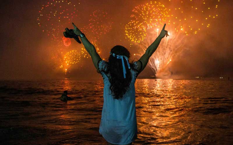 A woman celebrates as she watches the traditional New Year's fireworks at Copacabana Beach in Rio de Janeiro, Brazil, with an estimated three million revelers. [AFP]