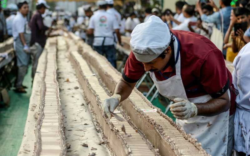 They spread chocolate ganache on the serpentine dessert stretched out on thousands of tables and desks at a festival ground and adjoining roads in the coastal state of Kerala's Thrissur city.