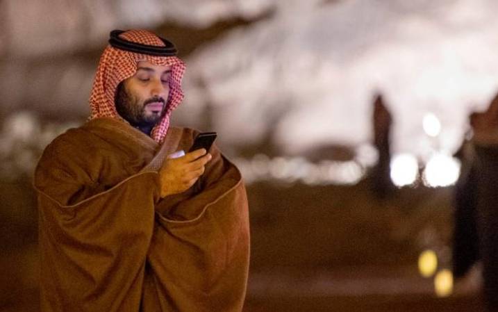 FILE PHOTO: Saudi Arabia's Crown Prince Mohammed bin Salman uses his phone during a meeting with Japan's Prime Minister Shinzo Abe in Riyadh, Saudi Arabia January 12, 2020. Bandar Algaloud/Courtesy of Saudi Royal Court/Handout via REUTERS/File Photo