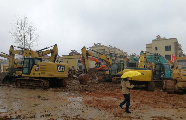 A man holding an umbrella walks past excavators at the construction site where the new hospital is being built to treat patients of a new coronavirus following the outbreak and the city’s lockdown, on the outskirts of Wuhan, China January 24, 2020. [cnsphoto via REUTERS]