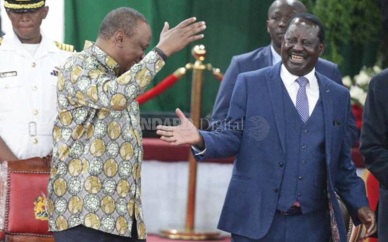 President Uhuru Kenyatta with Former Prime Minister Raila Odinga during the launch of Building Bridges Initiative report at Bomas of Kenya in Nairobi on November 27, 2019. [Stafford Ondego, Standard]