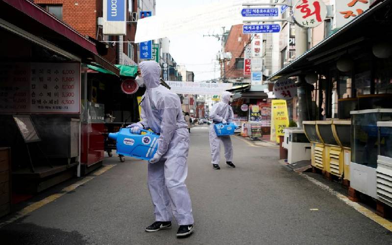 FILE PHOTO: Employees from a disinfection service company sanitize a traditional market in Seoul, South Korea, February 26, 2020. [Reuters]