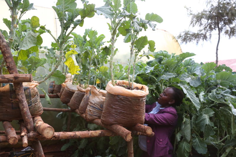 Leah Waithira at her vegetable garden in Nyeri. The first strategy is to select and grow healthy plants.[Kibata Kihu, Standard]