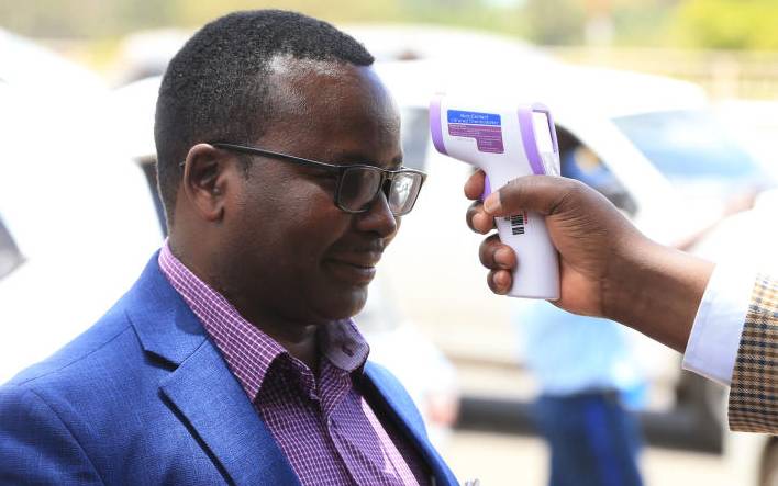 A man has his temperature checked at the entry of Afya House during a press briefing where the Health Cabinet Secretary Mutahi Kagwe confirmed that three more patients had tested positive for coronavirus. [Stafford Ondego, Standard]