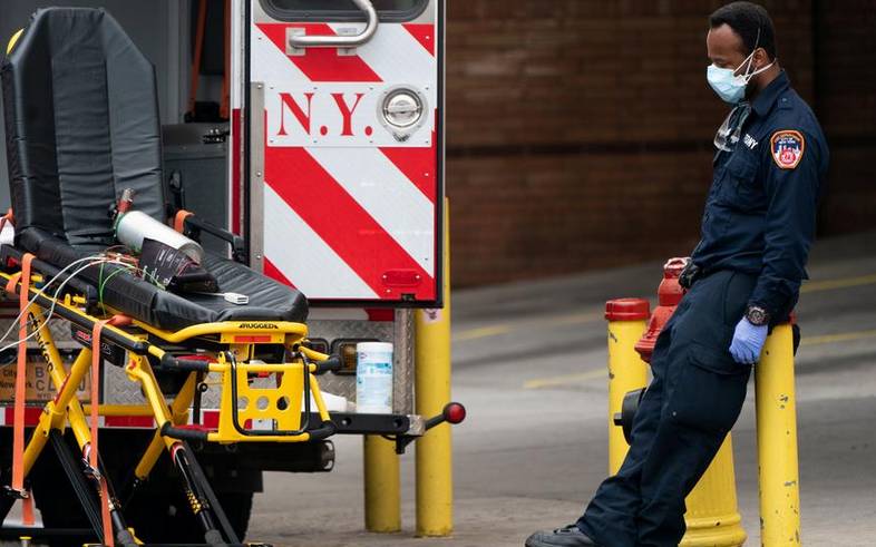 A healthcare worker takes a break outside Wyckoff Heights Medical Center during the outbreak of the coronavirus disease (COVID-19) in New York City, U.S., April 5, 2020. REUTERS/Jeenah Moon