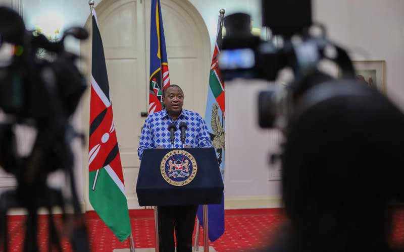 President Uhuru Kenyatta at a past press briefing on coronavirus pandemic. Supplies and equipment necessary for the war against the disease are still in short supply, exposing frontline healthcare workers to the virus. [File]