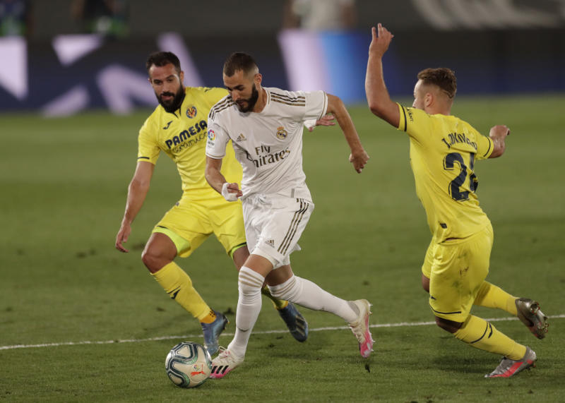 Real Madrid's Karim Benzema, centre, controls the ball as Villareal's Javi Ontiveros, right, tries to stop him during the Spanish La Liga soccer match between Real Madrid and Villareal at the Alfredo di Stefano stadium in Madrid, Spain, Thursday, July 16, 2020. (AP Photo/Bernat Armangue)