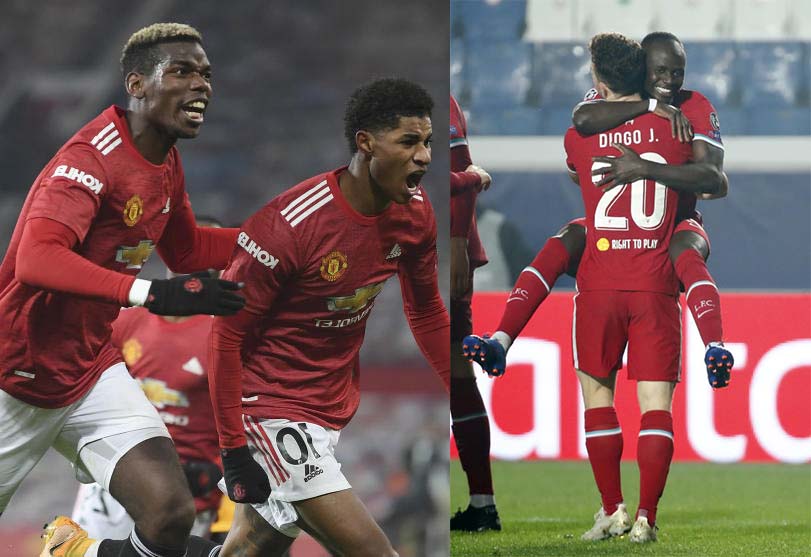 Manchester United's Marcus Rashford, left, celebrates with Paul Pogba after scoring the opening goal during the English Premier League soccer match between Manchester Utd and Wolverhampton Wanderers at Old Trafford stadium in Manchester, England, Tuesday, Dec. 29, 2020. (Michael Regan, Pool via AP)