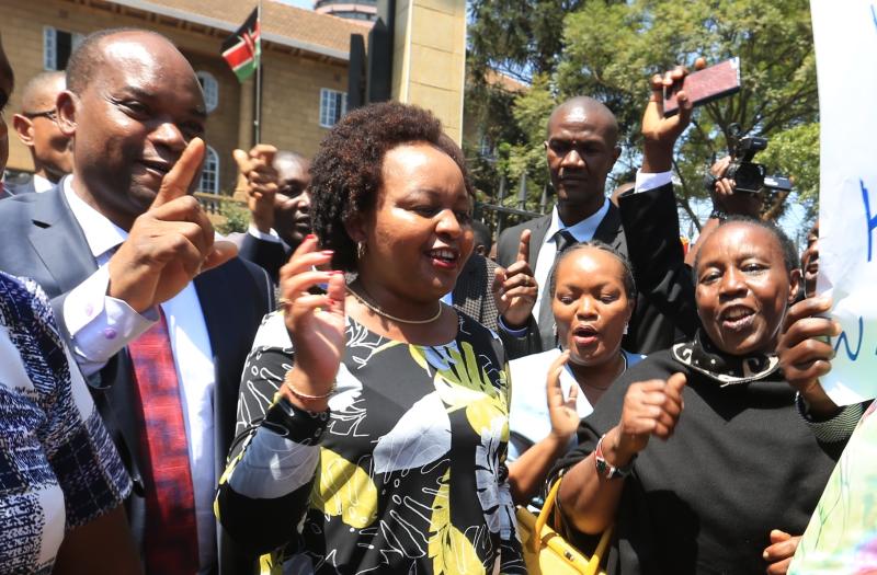Kirinyaga Governor Anne Waiguru and her supporters celebrate outside the Supreme Court after winning her case against Narc-Kenya leader Martha Karua on August 6, 2019. [George Njunge, Standard]