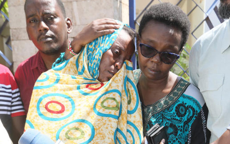 Mildred Odinga (left) is comforted by a friend, Betty Makena, outside the Aga Khan Hospital in Mombasa yesterday. [Omondi Onyango, Standard]
